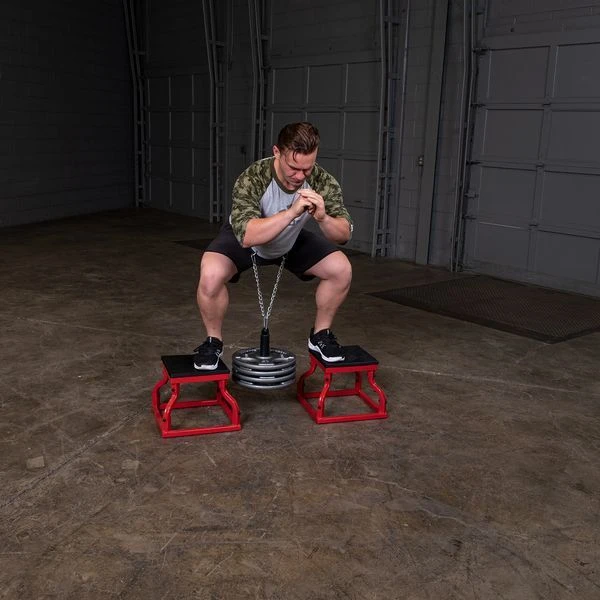 - Connect to weight belt for elevated belt squats