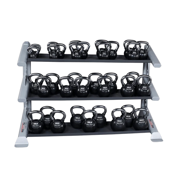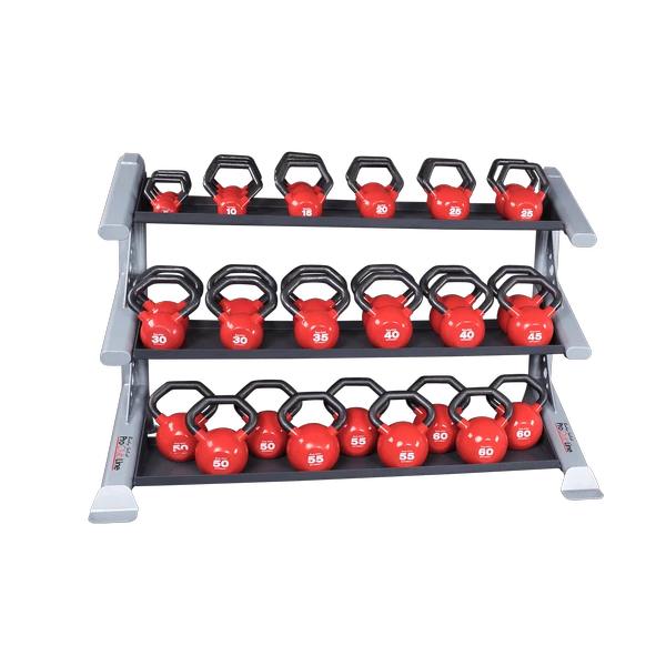 The SDKRKB Kettlebell shelf can hold a variety of KB Kettlebells, KBC Premium Kettlebells, KBL Kettleballs, or KBV Vinyl Kettlebells. The SDKRKB has a surface space of 59″ x 12″. Use the chart below to determine the approximate amount of kettlebells each shelf can hold.