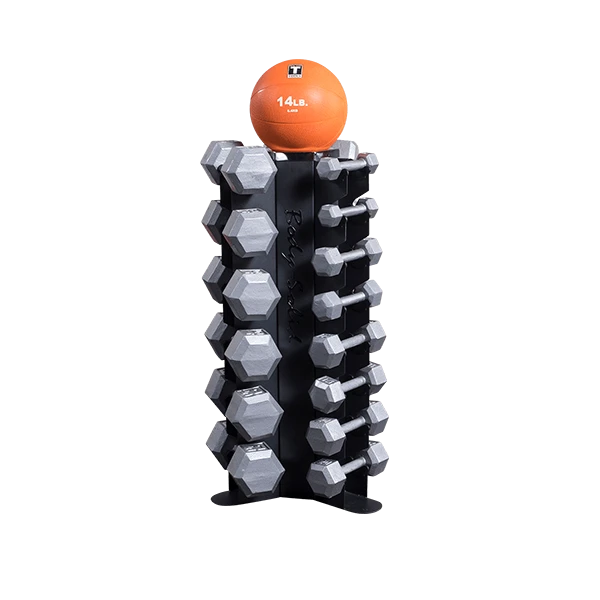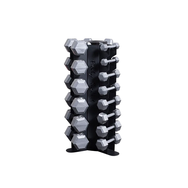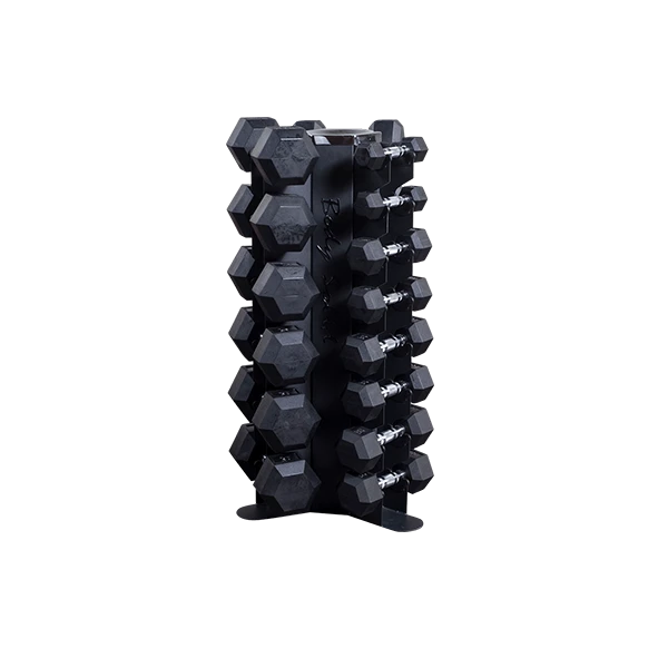 Body-Solid’s GDR80 Body-Solid Vertical Dumbbell Rack features vertical storage for 10 pairs of dumbbells, keeping workout spaces clean, organized and safe. The GDR80 conveniently holds up to 10 pairs of hex dumbbells of any size under 50lbs, and is perfect for home or studio use. A perfect fit for a 5-50lb hex dumbbell set, the GDR80’s compact vertical storage minimizes floor space compared to horizontal racks.