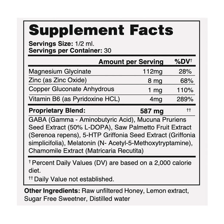 - GABA (Gamma – Aminobutyric Acid), Mucuna Pruriens Seed Extract (50% L-DOPA), Saw Palmetto Fruit Extract (Serenoa repens), 5-HTP Griffonia Seed Extract (Griffonia simplicifolia), Melatonin (N- Acetyl-5-Methoxytryptamine), Chamomile Extract (Matricaria Recutita)