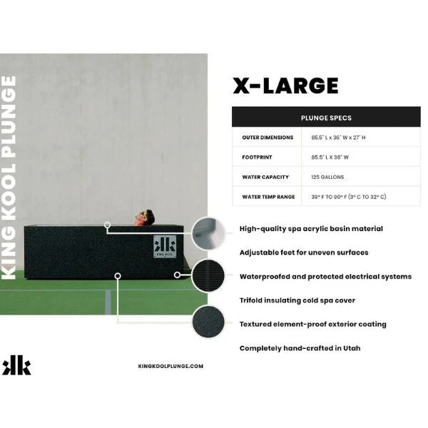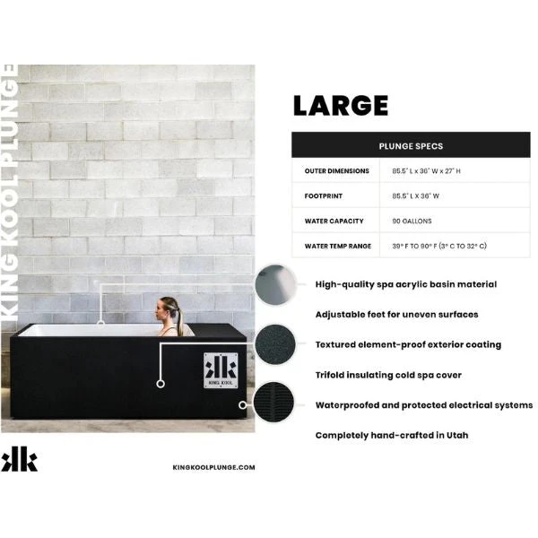 Health and wellness at its finest. Dip into a superior cold plunge experience with the Kings of Kool. A custom made spa acrylic reservoir with an outer shell that is built to withstand the elements.