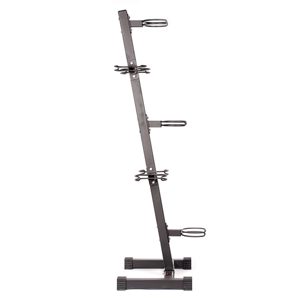 This vertical rack stores seven York medicine balls of any size in an easy to access format with three in the front and two on each side. The angled frame provides for equal weight distribution and plastic foot caps protect flooring.
